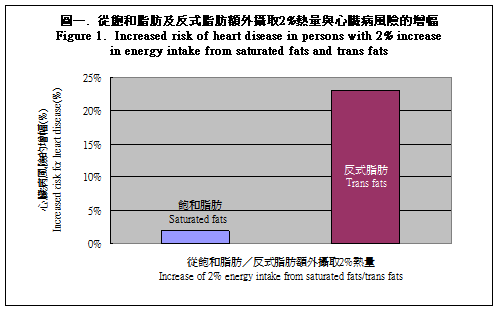 不同國家的人的反式脂肪攝取量會有差異,澳洲人的攝取量為熱量總攝取量的 0.6% ,而美國人則為每天熱量攝取量的 2.6% 。研究顯示,從反式脂肪額外攝取 2% 熱量 ( 即在每天攝取 2 000 千卡熱量的人?中,他們額外攝取約 4.4 克反式脂肪 ) 會導致心臟病風險增加 23% 。不過,如果增加的同等熱量是來自飽和脂肪,則心臟病風險只會增加 2%2 , 3 ( 圖一 ) ,因此,專家認為反式脂肪對健康造成的損害較飽和脂肪更大。