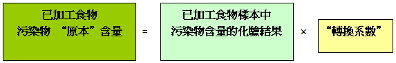 乾製、脫水或濃縮過程製成的已加工食物中某種重金屬的"原本"含量,可按以下公式計算出來: