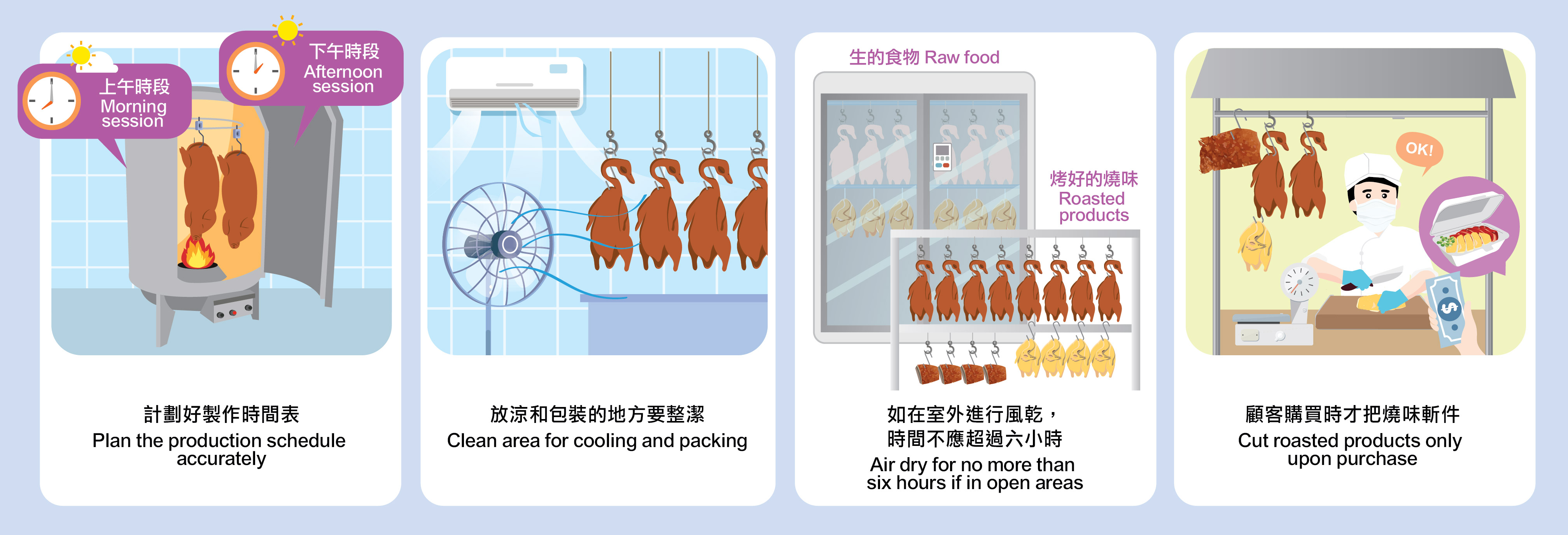 預先計劃精準的製作過程,以免過量製作及延長已烹煮的燒味在室温下存放的時間。每天分兩個或以上的烤製時段,以配合午市和晚市高峰期的需求,從而減少存放的時間。放入攝氏4度或以下的雪櫃或置於流動自來水下解凍肉類。切勿把肉類置於室温下解凍。