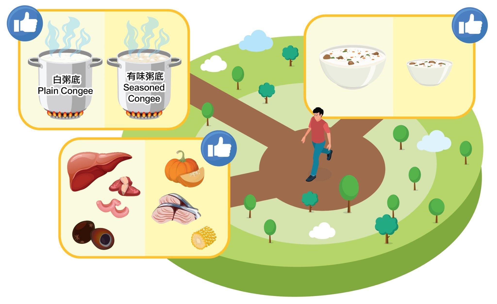 圖:作出健康選擇以減少進食粥品所攝取的鈉:選用鈉含量較低的配料如魚肉和蔬菜、選用只加入少許或不加調味料的白粥作為粥底及進食分量較少的粥品