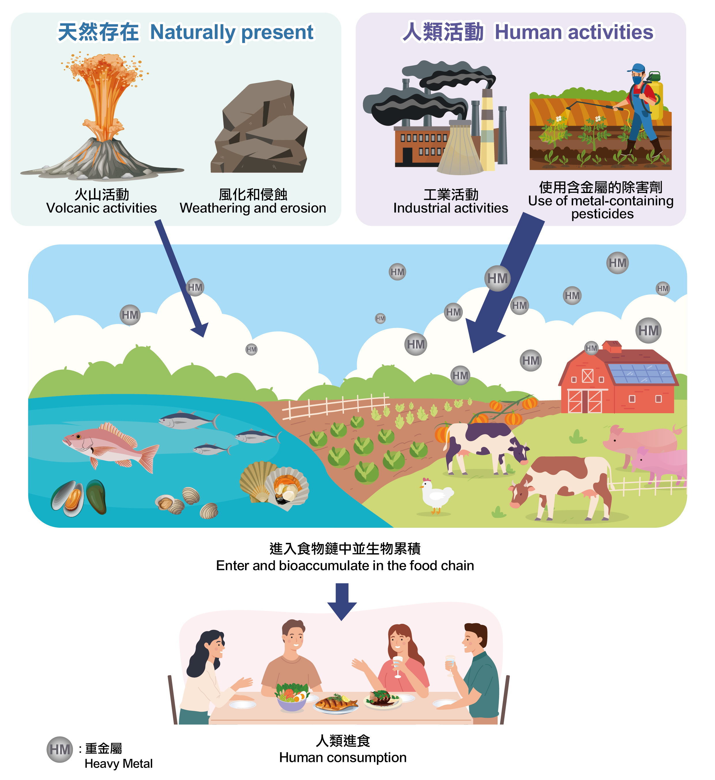 重金屬是在天然存在於環境中的物質,是地殼表面的基礎成分,天然存在於岩石、土壤和水中。當這些重金屬進入泥土和水時,便會輕易被我們食用的植物、動物和水中生物吸收,因此食物含有金屬污染物是無可避免的。