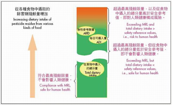 雖然制定最高殘餘限量可保障消費者的健康,但人們不應把它直接看成"食物安全上限"。事實上,除害劑的最高殘餘限量通常會訂在一個安全的水平。在這個水平及一般食用情況下,從食物中攝入的除害劑總分量會低於安全參考值(即每日可攝入量和急性參考劑量)(見圖一)。因此,只要從食物中攝入的除害劑總分量低於安全參考值,即使吃下的個別食物含有超出最高殘餘限量的殘餘除害劑,亦未必表示健康會受損。