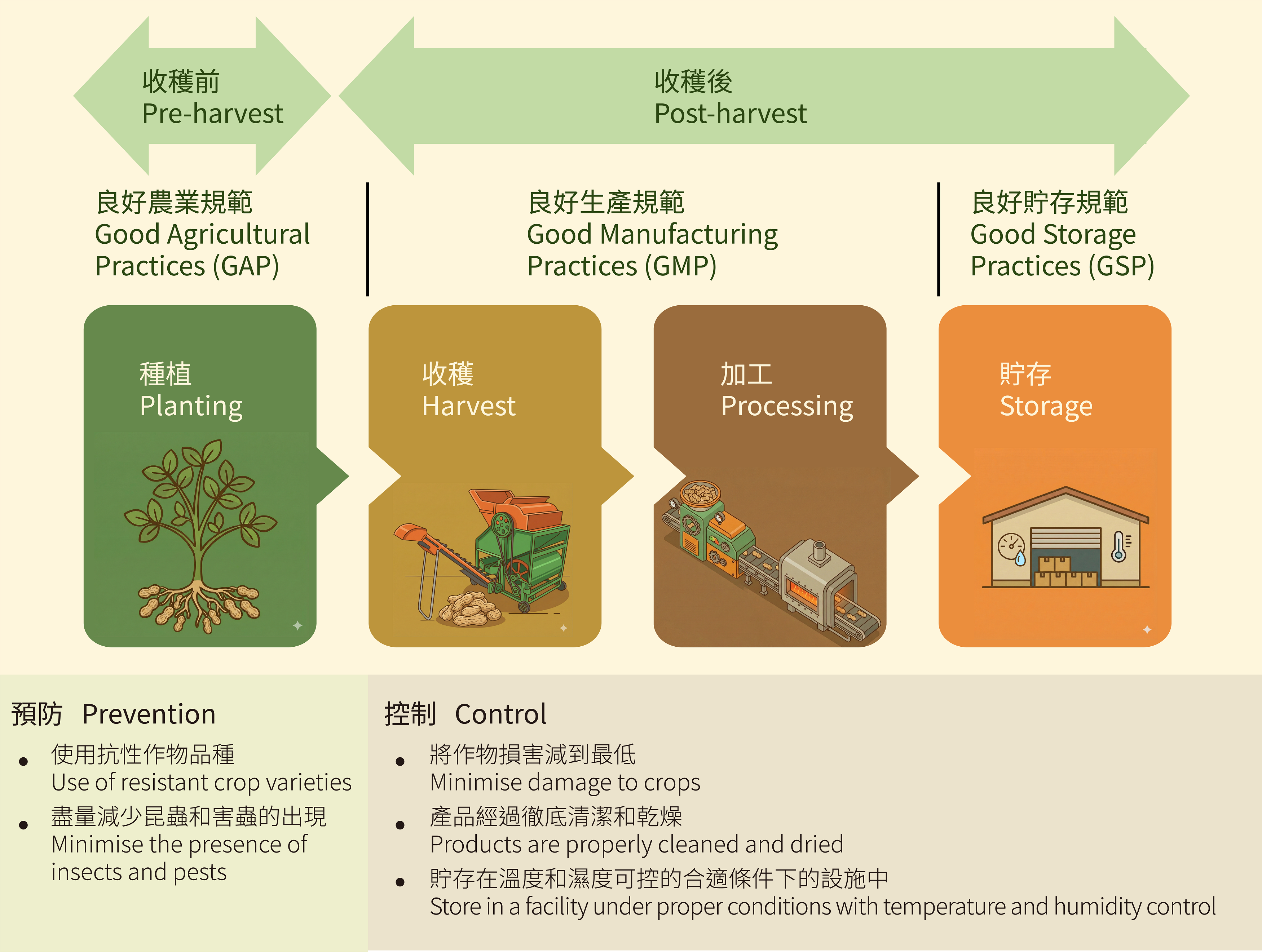 總括而言,食物生產者在收穫前應採用良好農業規範。而在收穫後處理、加工、貯存和分發供人食用的食物時,實施良好生產規範及良好貯存規範亦同樣關鍵。