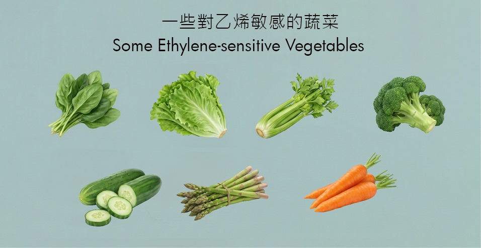 圖:產生乙烯的水果(例如蘋果、啤梨、桃、桃駁李、木瓜和哈密瓜)最好與對乙烯敏感的蔬菜(例如菠菜、生菜、芹菜、西蘭花、青瓜、蘆筍和紅蘿蔔)分開存放,以防止蔬菜過早變質。