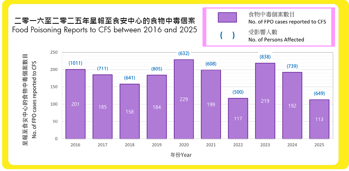 根據第599章《預防及控制疾病條例》,食物中毒是香港法定須呈報的疾病。醫生必須向衞生署呈報所有懷疑食物中毒個案。過去十年,與食肆有關的食物中毒個案呈報宗數在每年113宗至229宗之間波動。二零二五年,食安中心接獲113宗由衞生署轉介的食物中毒個案,涉及649人。今年的個案數字為過去十年來最低。