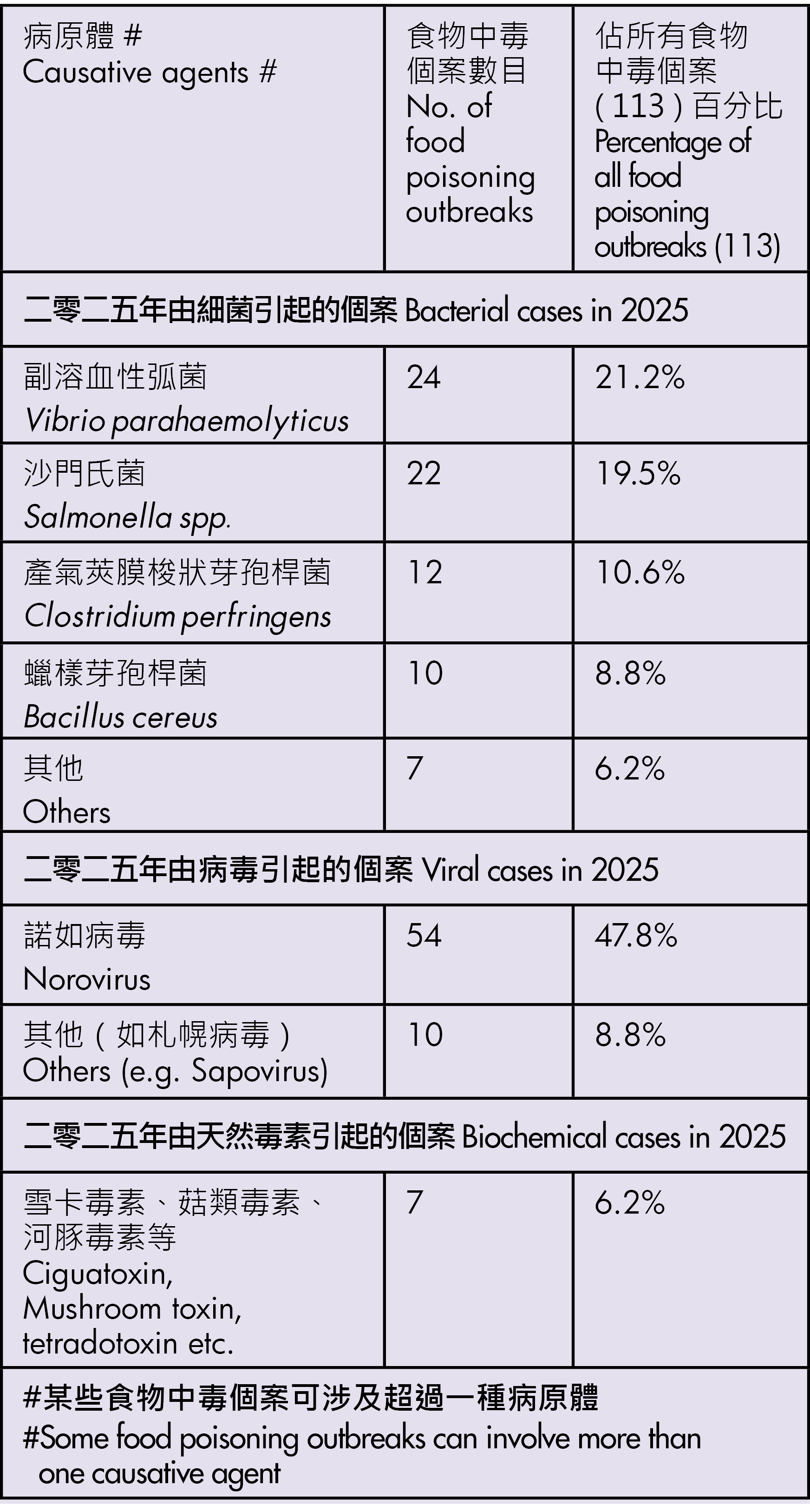 由於衞生防護中心在二零二五年呈報的部分食物中毒個案涉及多於一種病原體,因此病原體的總百分比超過100%。在食安中心於二零二五年記錄的所有食物中毒個案中,細菌性病原體仍然是主要成因。在113宗個案中,有64宗(56.6%)由細菌引起。在所有由細菌引起的個案中,前三大細菌為副溶血性弧菌(24宗,21.2%)、沙門氏菌(22宗,19.5%)和產氣莢膜梭狀芽孢桿菌(12宗,10.6%)。病毒感染個案(55宗)佔二零二五年食物中毒個案的48.7%,當中54宗與諾如病毒有關。其餘 6.2%的食物中毒個案與天然毒素有關(例如雪卡毒素、河豚毒素、貝類毒素)。整體而言,「食用生的食物」(38.9%)、「貯存溫度不當」(25.7%)和「受生的食物污染」(23.9%)是二零二五年所有食物中毒個案中最常見的三大成因。