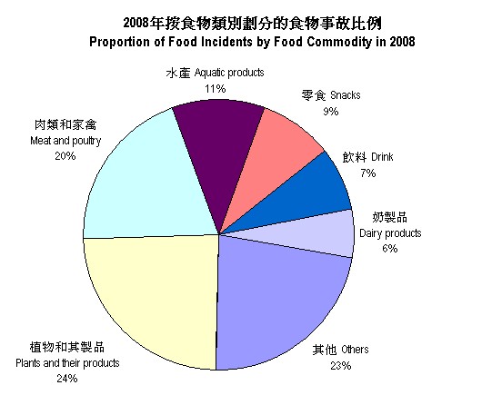 以食物種類而言,食物事故最常涉及蔬菜、豆類、穀類、水果和其製品(24%),其他主要食物類別則有肉類和家禽(20%)、水產(11%)及零食(9%)(見圖二)。