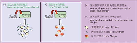 由於基因工程中會出現意外影響,轉移通常不會引致過敏的食物基因亦可引致過敏反應。"意外影響"指在既定改變以外的影響,而這些影響可能在基因序列隨機植入植物基因組內的過程中發生。被植入基因可能會改變內源基因的表達,令特定蛋白質出現過量或不足的表達。如寄主植物含有已知的致敏蛋白質,加入新的基因會增強致敏原的表達,植物可能會更容易引起過敏(圖1A)。此外,植入基因序列亦可產生令個別易受影響人士過敏的其他新的蛋白質(圖1B)。