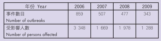 表一 2006-2009年由食物安全中心記錄的有關食肆/食物業的食物中毒事件數目及受影響人數