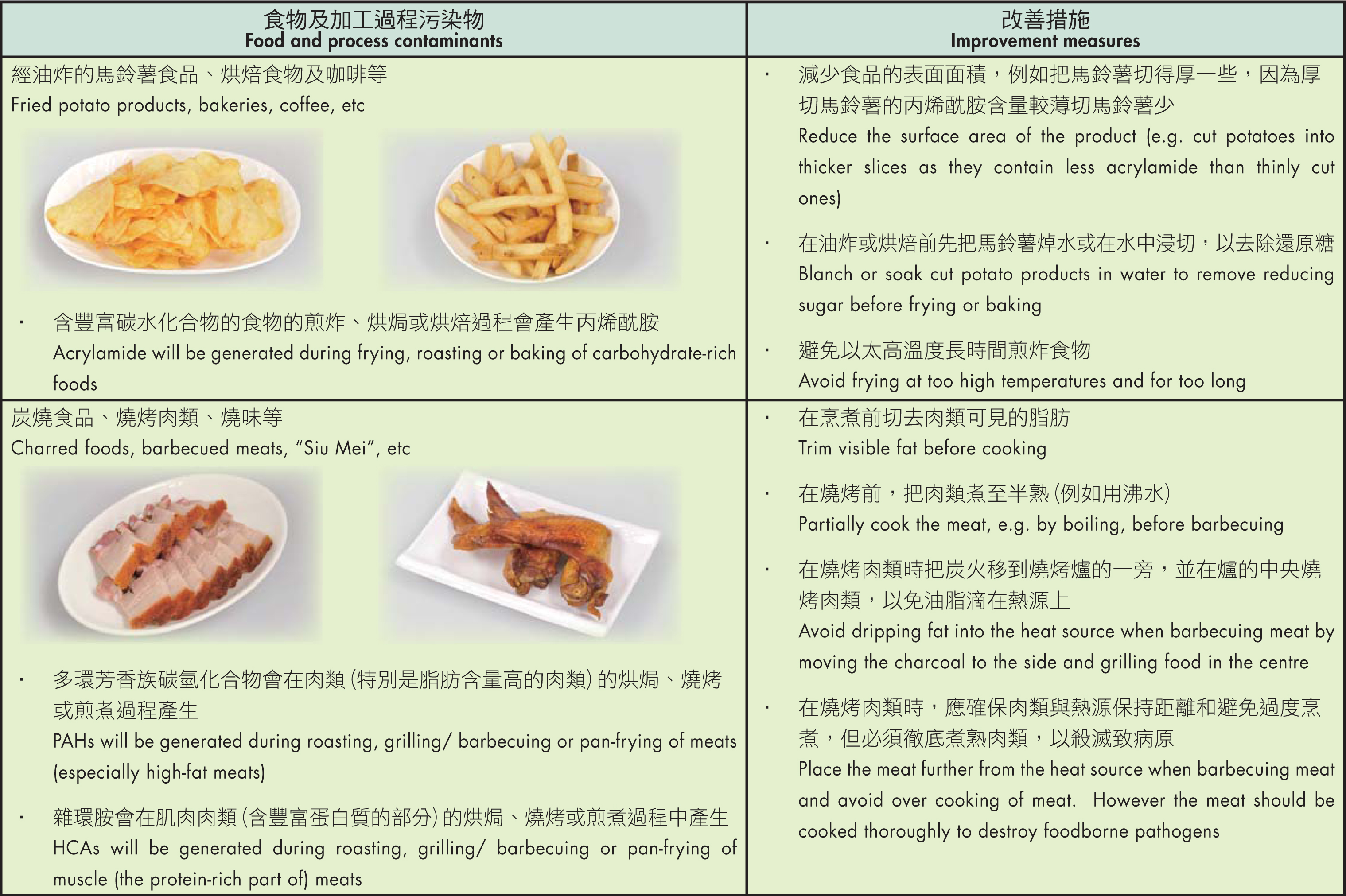 對消費者而言,簡單而又有效減低風險的方法是保持均衡及多元化飲食,包括進食多種蔬果,不要進食太多煎炸、燒烤和肥膩食物。此外,宜採用清蒸或水煮兩種方法烹調食物,特別是肉類及含豐富碳水化合物的食物。如選用油炸、烘焙和燒烤方法烹調食物,消費者應採取措施減少加工過程污染物(見表一)。