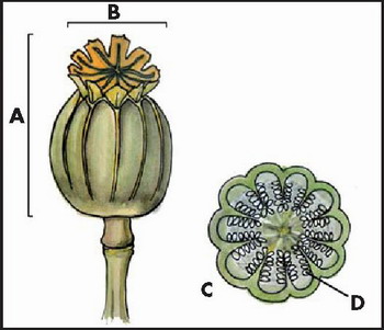 成熟的罌粟殼各部分(A:成熟的罌粟殼;B:柱頭;C:成熟罌粟殼的橫切面;D:種子)