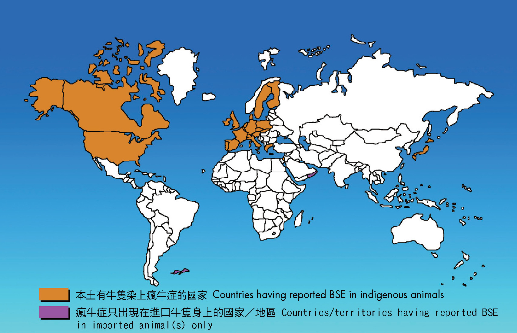瘋牛症於一九八六年在英國首次被發現,肇因是英國農民把病牛的肉骨粉作為補充劑加入飼料中餵飼牛犢。在這場疫症中,以英國和歐洲各國的疫情最為嚴重,亞洲國家及美國僅有零星個案(圖一)。在瘋牛症肆虐最烈的英國,有超過18萬頭牛染病,440萬頭牛在撲殺行動中被宰殺。