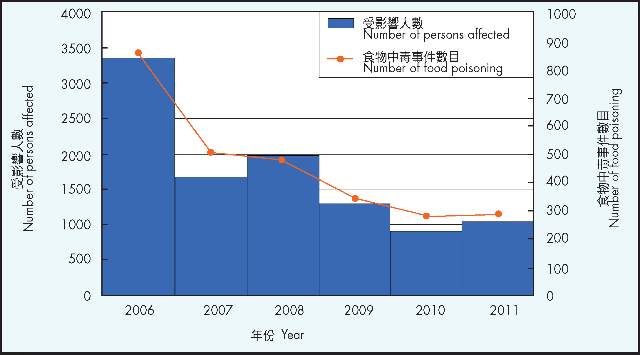 食物安全中心(中心)專責調查有關食肆及食物業的食物中毒事件。二零一一年,中心接獲290宗由衞生署轉介的食物中毒個案,受影響人數共1036人。自二零零六年起,食物中毒事件總數持續下降。但二零一一年的數字較二零一零年輕微上升(見圖一)。