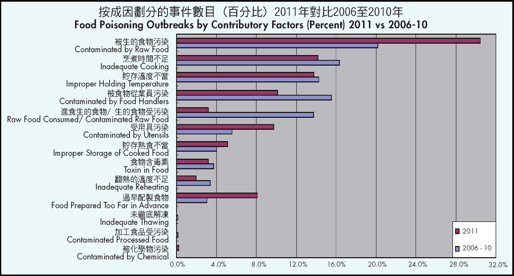 生熟食物交叉污染、烹煮時間不足、貯存溫度不當和被食物從業員污染是二零一一年食物中毒事件最常見的四個成因,情況與過去五年大致相若(見圖二)。