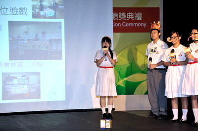 東華三院辛亥年總理中學(初中組最佳演繹獎得主)以話劇形式與在場人士分享他們透過攤位遊戲、講座、問答比賽等將營養標籤推廣給家長、同學及小學生的經驗。