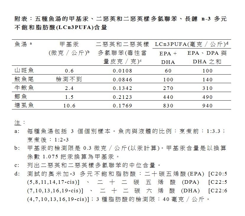 - 是次進行飲用魚湯的風險和益處的評估集中研究通常用作配製魚湯供產後或授乳的婦女飲用的5種魚類,包括山斑魚、鯇魚尾、牛鰍魚、鯽魚和塘虱魚。研究測定魚湯內的二噁英和二噁英樣多氯聯苯、甲基汞、長鏈n-3多元不飽和脂肪酸(包括二十碳五烯酸(EPA)、二十二碳五烯酸(DPA)和二十二碳六烯酸(DHA))含量(參閱附表)。結果顯示長鏈n-3多元不飽和脂肪酸含量較高的魚湯,一般其甲基汞或二噁英和二噁英樣多氯聯苯的含量亦較高。