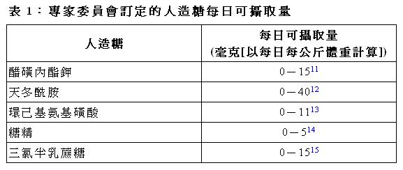 22. 估計的攝取量繼而與專家委員會訂定的各種人造糖每日可攝取量( 表1) 比較。