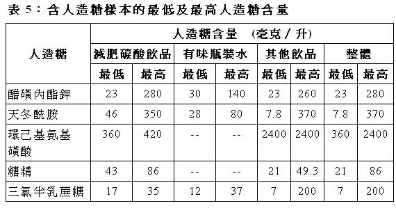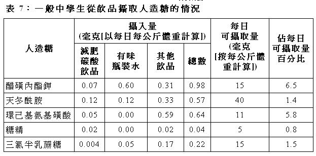 39. 一般中學生每日從飲品攝取到研究選取的各種人造糖的分量,按每公斤體重計算,估計分別為0.98 毫克醋磺內酯鉀、0.57 毫克天冬酰胺、0.64 毫克環己基氨基磺酸、0.04 毫克糖精和0.22 毫克三氯半乳蔗糖。這些分量全部沒有超出專家委員會就這些人造糖訂定的每日可攝取量:其分量相對每日可攝取量的比率由糖精的0.8% 至醋磺內酯鉀的6.5% 。
