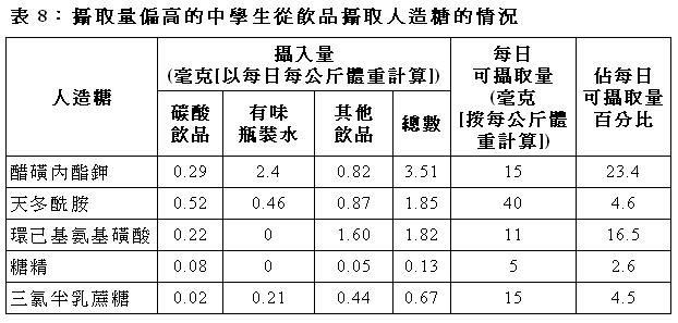 26. 食環署又為攝取量偏高的中學生進行分析,評估他們可能面對的風險。在這項研究中,人造糖攝取量百份位第95 位定為攝取量偏高的中學生的攝取量水平。表8 列載有關結果。