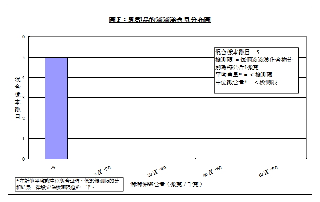 26.把六個滴滴涕化合物的含量相加起來,便得出每個混合樣本的滴滴涕含量。如分析值低於檢測限,食物樣本中滴滴涕含量的真正數值可能介乎零與檢測限值之間。當某個食物類別的大部分分析結果都低於檢測限時,如何處理這些分析結果尤其重要。雖然把所有分析值低於檢測限的樣本的滴滴涕含量假設為零並不恰當,但把檢測不到滴滴涕的樣本設定為檢測限值,則會過份高估從食物攝取滴滴涕的含量。在這項研究中,所有低於檢測限的分析結果,都設定為檢測限值的一半。由於食物中的污染物(包括滴滴涕)含量一般都按照對數正態的形式分布,因此,把所有檢測不到滴滴涕的樣本的分析結果設定為檢測限值的一半,屬於保守的做法,尤其是某些食物類別中大部分食品的滴滴涕含量都低於檢測限。