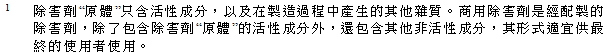 19.二零零零年,農藥殘留聯合會議根據大鼠發育毒性的最大無不良作用劑量(即按每公斤體重計算每天最多可攝取1毫克),以及安全系數1009,12,把每日可容忍攝入量暫定為按每公斤體重計算是0.01毫克。暫定每日可容忍攝入量是指估計人於一生中可攝取多少污染物而不致帶來明顯風險的劑量。攝入量高於暫定每日可容忍攝入量並不表示健康一定會受損。暫定每日可容忍攝入量着重於一生攝取的分量,只要並非長期超出,偶然高於可容忍水平也不會影響健康。