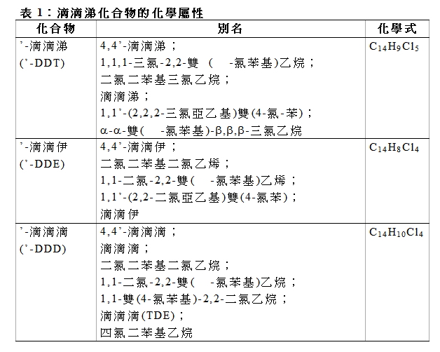 4.滴滴涕是一種活性範圍很廣泛的有機氯殺蟲劑5,6,7。滴滴涕一詞一般是指對,對' -滴滴涕(p,p ' -DDT)。商用滴滴涕除害劑或滴滴涕原體的主要成分一般是對,對' -滴滴涕(p,p ' -DDT)(65至80%),另有小量化合物包括鄰,對' -滴滴涕(o,p ' -DDT)(15至21%)、對,對' -二氯二苯基二氯乙烷(p,p ' -DDD)(可達4%)等,以及污染物1-(對-氯苯基)-2,2,2-三氯乙醇(可達1.5%)。滴滴涕的其他形式包括鄰,對' -滴滴涕(o,p ' -DDD),以及對,對' (p,p ' )-及鄰,對' (o,p ' )-二氯二苯基三氯乙烯(DDE),這些都是雜質或是滴滴涕原體的代謝物6,7。在本報告中,「滴滴涕」一詞指滴滴涕(DDT)、滴滴伊(DDE)和滴滴滴(DDD)的所有對,對' (p,p ' )-及鄰,對' (o,p ' )異構體混合物。上述的滴滴涕化合物的化學屬性載於表1。