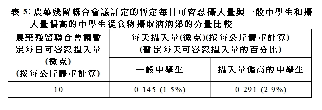 攝取量一般和攝取量偏高的中學生,每天從膳食中攝取滴滴涕的分量,按每公斤體重計算,分別是0.145微克和0.291微克,遠低於聯合國糧食及農業組織∕世界衞生組織農藥殘留聯合會議(JMPR)暫定的每日可容忍攝入量,即按每公斤體重計算為10微克。因此,我們的結論是,不論攝取量屬一般還是偏高的中學生,出現滴滴涕毒性的機會均不大。