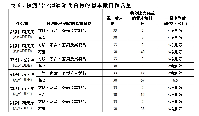 25.化驗分析工作由食物安全中心食物研究化驗所負責。所有食物樣本都是以可供食用的狀態來處理和分析,以便更能準確地評估滴滴涕的攝入量。我們把每種食物的三個樣本混合和拌勻成為混合樣本,然後用環己烷萃取混合樣本,再以凝膠滲透色譜儀淨化,以及用氣相色譜—質譜儀測定六個滴滴涕化合物含量。該六個滴滴涕化合物的檢測限,每個都是每公斤1微克(十億分率)。我們所採用的檢測限,與世界各地用以評估從食物攝取滴滴涕含量的檢測限相約,並較澳洲和新西蘭的總膳食研究所採用的檢測限為低。