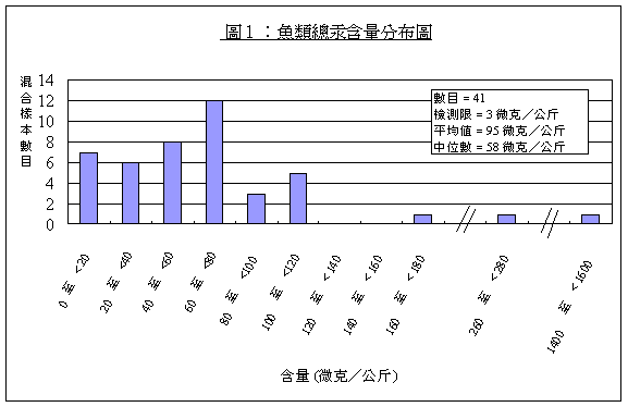 28. 我 們 共 抽 取 了 347 個 食 物 樣 本 , 混 合 成 為 115 個 混 合 樣 本 進 行 分 析 。 表 1 載 列 每 類 食 物 的 總 汞 和 甲 基 汞 的 含 量 中 位 數 。