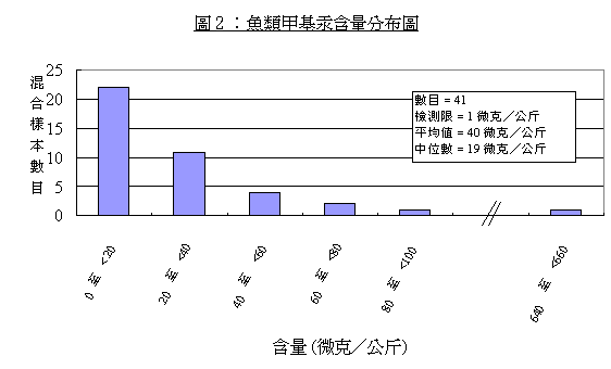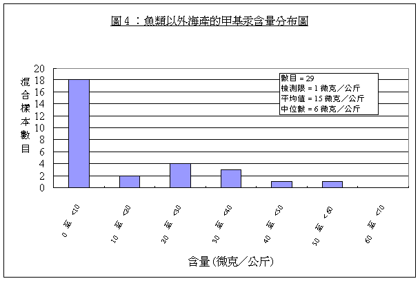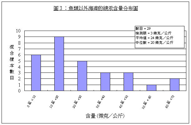 29. 「 魚 類 」 和 「 魚 類 以 外 的 海 產 」 的 所 有 樣 本 , 均 檢 測 到 總 汞 和 甲 基 汞 。 至 於 其 餘 食 物 類 別 , 則 只 有 少 數 樣 本 檢 測 到 低 水 平 的 總 汞 , 而 這 些 樣 本 均 檢 測 不 到 甲 基 汞 。 附 件 I 載 列 「 魚 類 」 和 「 魚 類 以 外 的 海 產 」 的 總 汞 和 甲 基 汞 的 含 量 分 布 圖 。