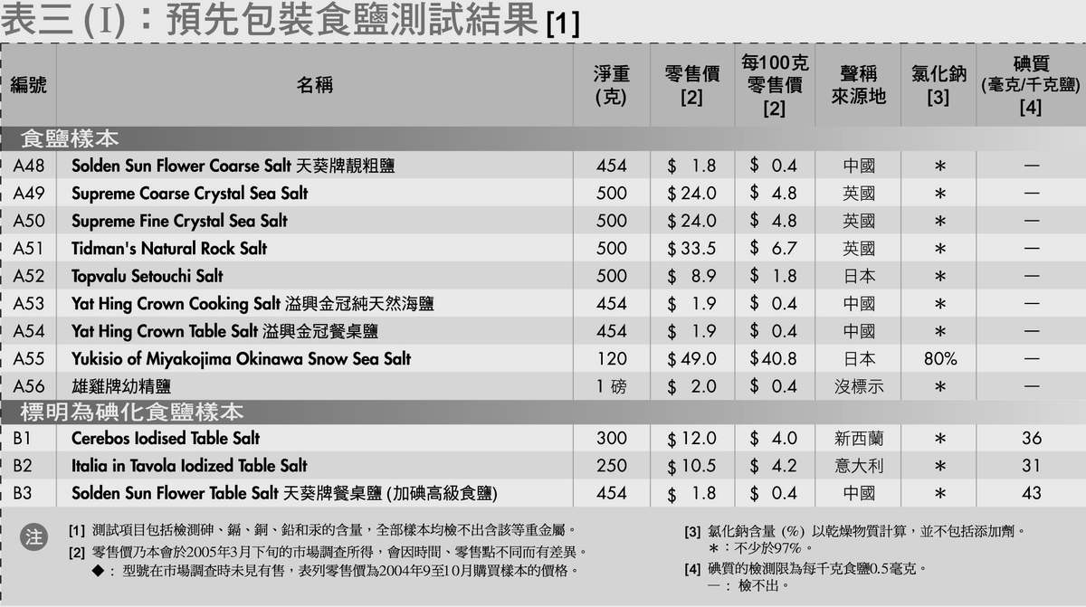 是次測試所選取的59個預先包裝食鹽樣本中,只有3個產品(#B1-B3)標明為碘化食鹽;而#B1及#B2在配料表上有列明添加了碘酸鉀或碘化鉀等碘化合物。這3個產品的碘質含量分別為每千克鹽36、31和43毫克。至於其他未有標明為碘化食鹽的產品中,有1個(#A47)含少量碘質,含量為每千克鹽1.7毫克,相信並非製造商額外添加,可能是天然存在於食鹽中。至於15個散裝食鹽樣本,全部均沒有發現含碘質。