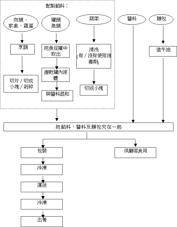 - 製 造 三 文 治 的 過 程 包 括 選 購 食 物 原 料 、 配 製 餡 料 、 把 餡 料 夾 在 麵 包 內 , 以 及 包 裝 和 運 送 ∕ 供 顧 客 食 用 。 三 文 治 的 一 般 製 造 流 程 載 於 圖 1 。