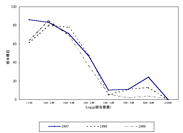 - 食 物 中 的 總 含 菌 量 及 大 腸 桿 菌 含 量 ( 總 數 ) 能 反 映 食 物 的 衞 生 品 質 。 一 九 九 七 至 一 九 九 九 年 間 , 先 後 發 現 有 82 個 三 文 治 樣 本 的 總 含 菌 量 達 不 滿 意 水 平 , 而 所 有 樣 本 的 大 腸 桿 菌 含 量 ( 總 數 ) 均 達 滿 意 水 平 。