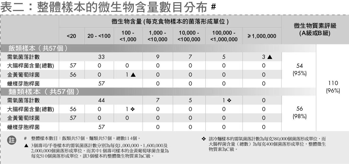 另外,所有飯類樣本的大腸桿菌含量(總數)和蠟樣芽胞桿菌含量均分別少於每克20個及1,000個菌落形成單位。