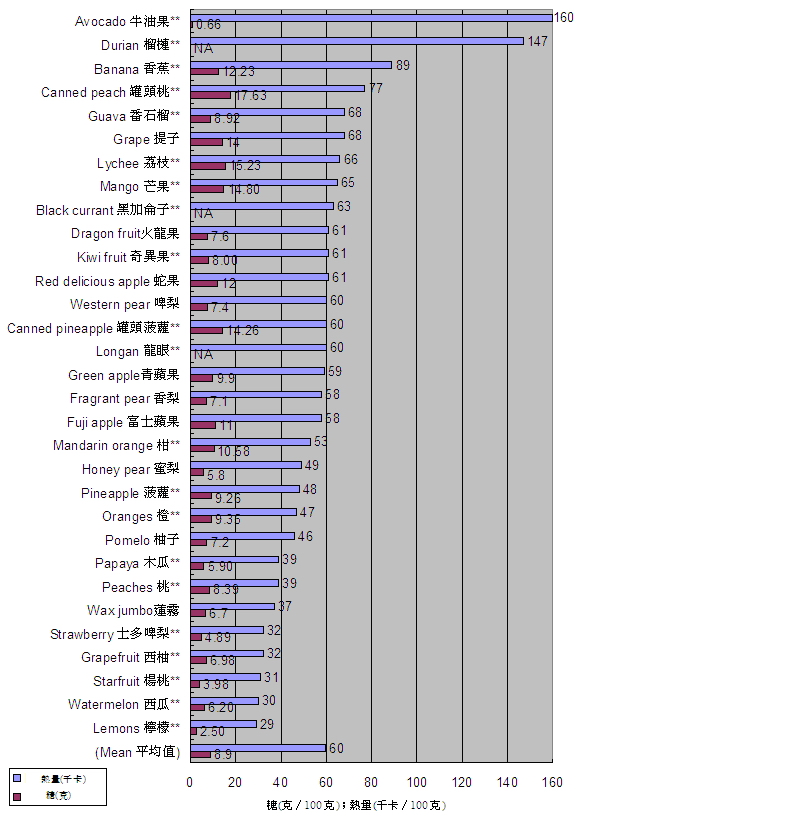 | 榴槤 ** | 179 | 32.91 | 1.79 | 6.48 | 沒有資料 | 0 | 沒有資料 | 4.6 | 7 | 2 | 23.9 | 1/2 杯 ( 果肉 ) | 122 |