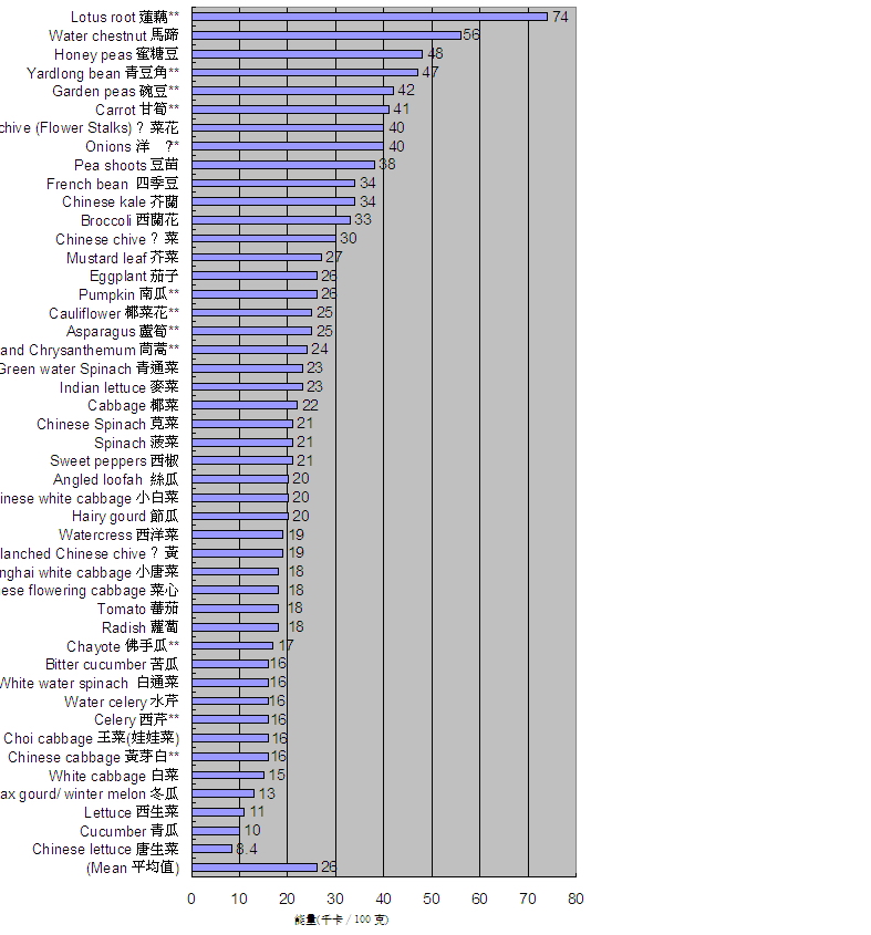 31. 與水果一樣,蔬菜所含的熱量偏低,每 100 克蔬菜所含的熱量為 8.4 千卡至 74 千卡,平均含 26 千卡 ( 圖 8) 。不過,如在烹煮和調味過程中加添脂肪和油,蔬菜所含的熱量便可能大大增加。