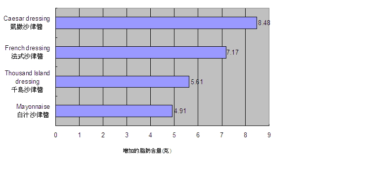 33. 這項研究亦分析了添加醬料對焯菜或沙律菜脂肪總含量的影響。進食生菜和西蘭花等沙律菜時,通常會添加沙律醬,例如千島沙律醬、法式沙律醬、凱撒沙律醬和白汁沙律醬。如圖 10 所示,一份 ( 一碗 ) 沙律菜添加一湯匙沙律醬後,每份菜的脂肪含量增加 5 至 8 克。另一方面,我們發現焯菜添加豉油、甜豉油、蠔油或腐乳醬後,其脂肪總含量變動不大。不過,添加這些醬油可能增加菜的鈉含量。本署已在早前公布有關中式點心的研究結果中,闡述添加不同醬油對焯菜的鈉含量的影響 ( 報告書可於食物安全中心的網頁瀏覽: http://www.cfs.gov.hk/english/programme/programme_rafs/programme_rafs_n_01_03_ra_dim_sum.html) 。