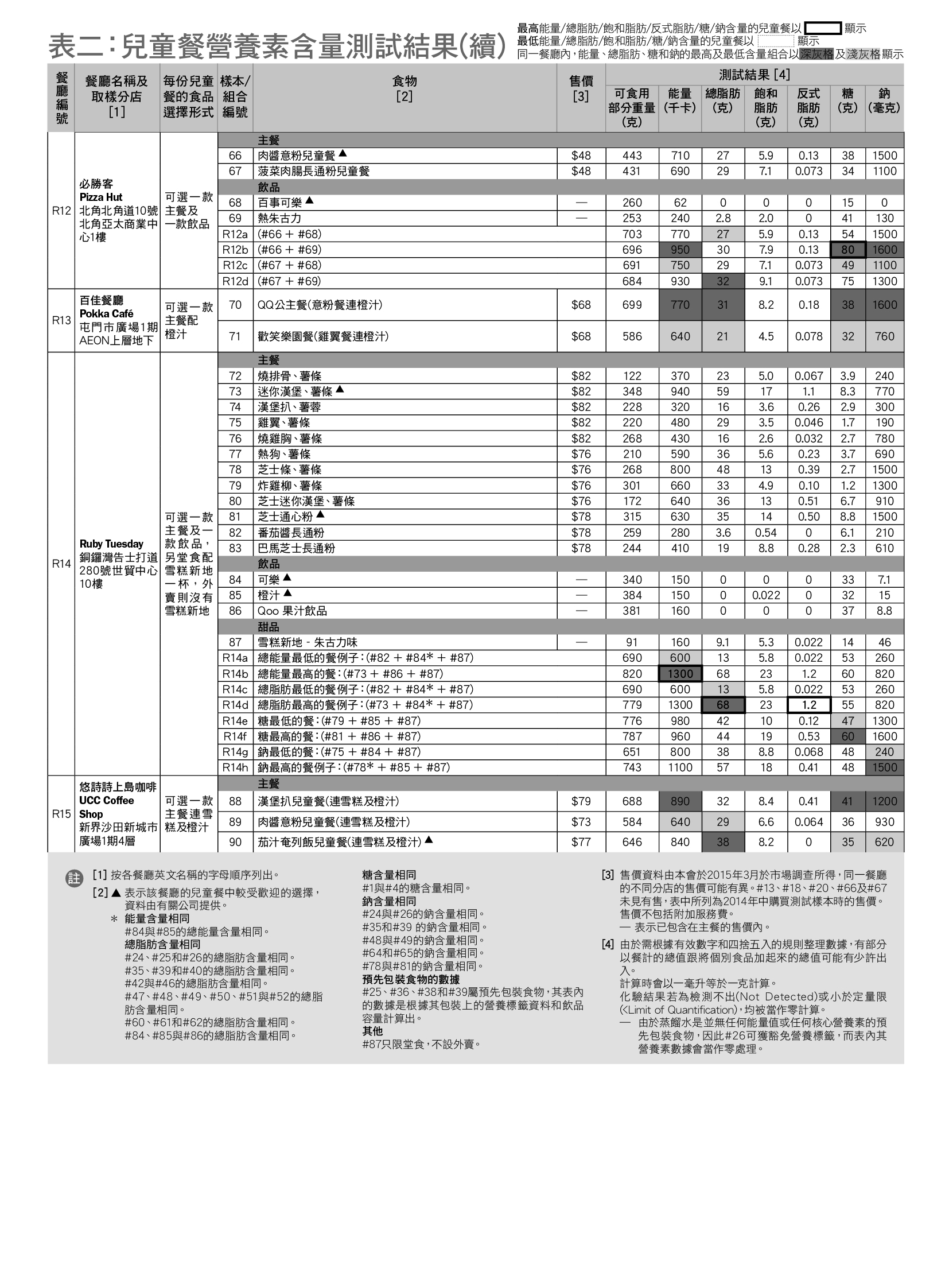 表二列出每個兒童餐樣本所包括的食物的測試數據,由於各個兒童餐的食物分量都可能不同,因此,亦一併列出可食用部分的重量供消費者參考。此外,為方便消費者更容易瞭解一些多組合的兒童餐,表二亦標示了部分供應較多兒童餐組合的食肆的兒童餐樣本中能量、總脂肪、糖和鈉最高和最低的組合例子,消費者可自行把可選的兒童餐食物組合的營養素數值相加起來,得出該兒童餐的大約營養素數值。消費者比較兒童餐不同的營養素含量時,應按個別兒童的年齡和活動量來釐定合適的每天建議攝入量。