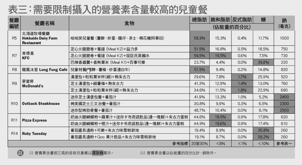 最高總脂肪含量的組合樣本來自「Ruby Tuesday」(R14),其迷你露比漢堡餐(R14d)包括的迷你漢堡、薯條(#73)加飲品(#84、#85或#86其中1款)加朱古力味雪糕新地(#87)含有68克總脂肪。以中等活動量兒童的能量需要計算,此兒童餐已佔一個7歲男童或女童每餐脂肪宏量營養素可接受範圍(acceptable macronutrient distribution ranges,簡稱AMDR)上限的3.6倍或約3.9倍。對比每天建議的總脂肪攝取量,該兒童餐組合樣本的總脂肪含量已以倍計超出7歲兒童每天上限的三分之一,更已超出3歲至9歲兒童的每天建議攝入上限。