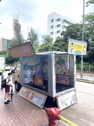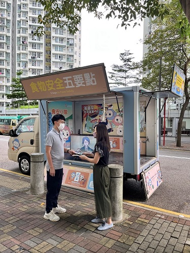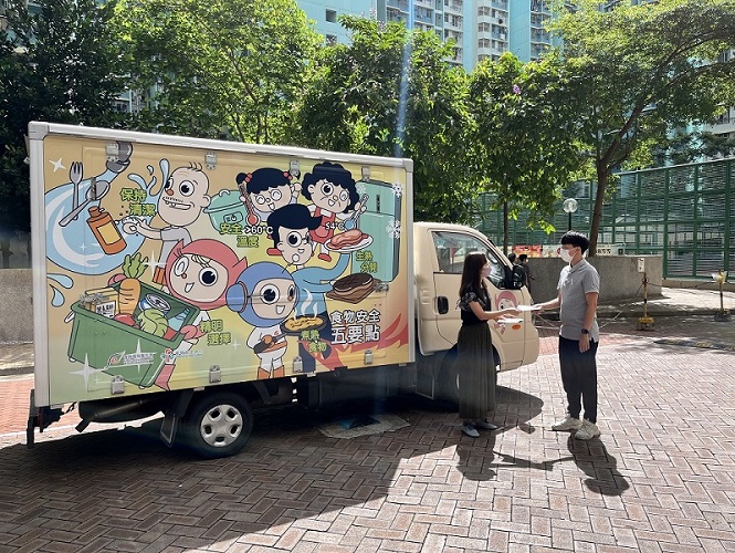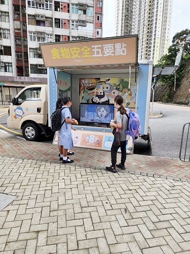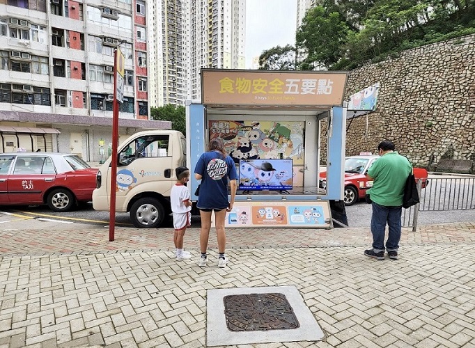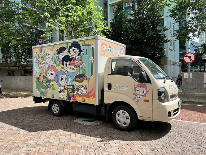 食物安全中心(中心)的全新廣播車輛現已投入服務,車身上有漫畫介紹食物安全與衞生資料。車內設有大型屏幕電視,供參觀者觀賞中心製作的短片,加深對食物安全五要點的認識。