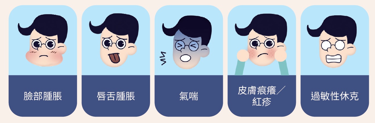 食物過敏的常見症狀包括紅疹、臉部或舌頭腫脹、氣喘及皮膚痕癢。