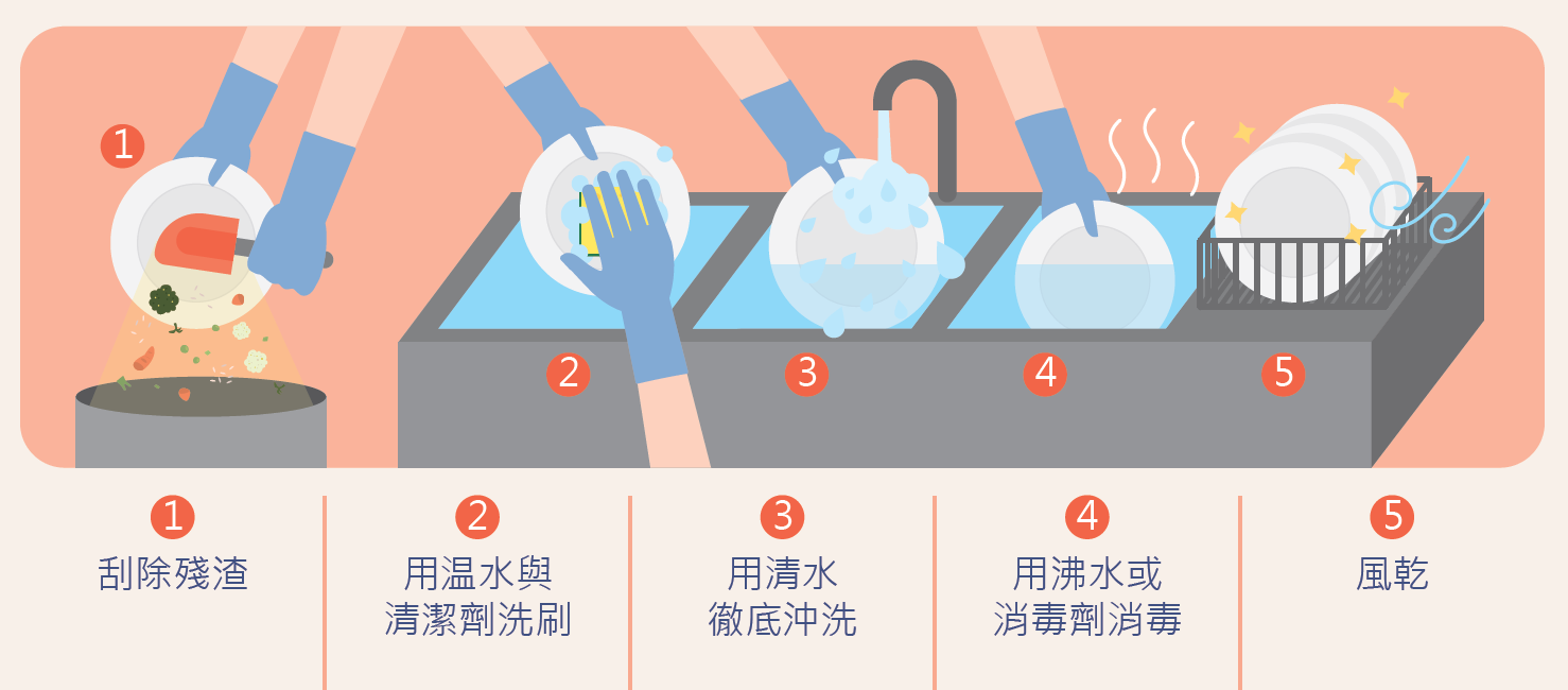 確保所有接觸食物的用具,包括可重覆使用的餐盒和餐具,經洗淨和消毒後均有妥善存放。所有與食物接觸的物品都必須以能去除食物殘渣、污垢、油脂並殺死食源性病原體的5步驟進行有效清潔和消毒。