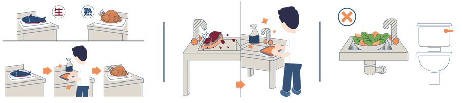 使用獨立的食物預備區來分別處理生食、熟食、即食食物及高風險食物。(例如即食生蠔與刺身)。不可擅自更改區域用途。如需在同一區域處理生食、熟食及即食食品,每次使用後須徹底清潔消毒。