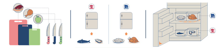 如須把生的食物和熟食或即食食物貯存在同一雪櫃內,必須以有蓋的容器貯存,並把熟食和即食食物放在雪櫃上層,生的食物放在下層,以防生的食物的汁液滴在熟食或即食食物上。