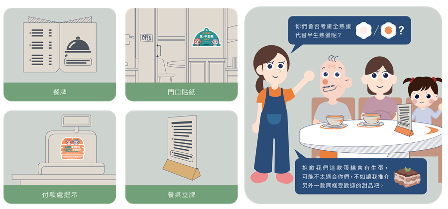 食肆有責任提供準確及充分的食物資料,以助消費者作出明智的選擇。此舉不單可以保障消費者,尤其是高危人士,免受食源性疾病的侵害,亦可提升食肆的盡責形象。此外,前線員工也可以就高風險食物提醒顧客,例如:你們會否考慮全熟蛋代替半生熟蛋呢?