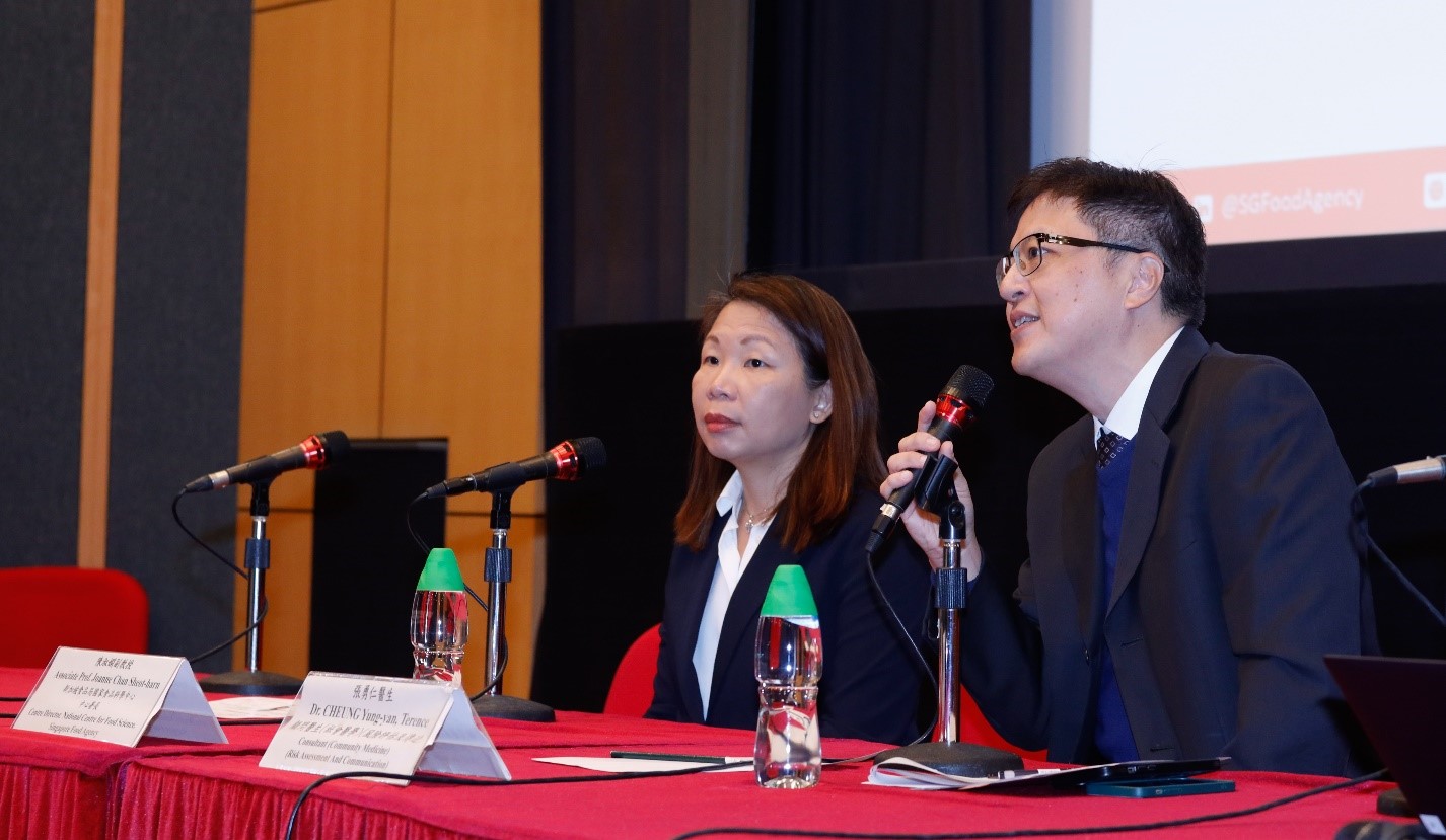 食物安全專員黃宏醫生(圖右)與新加坡食品局國家食品科學中心中心署長、食物安全專家委員會委員陳淑嫻副教授 (圖左)合照