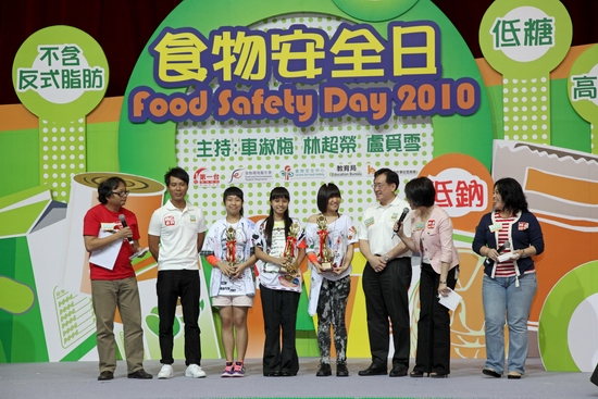 食物安全專員陳漢儀醫生(右一)頒發獎項予營養標籤團體照片比賽勝出的聖公會林護紀念中學代表