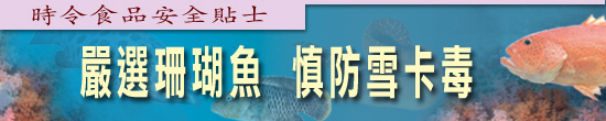 - 避 免 進 食 珊 瑚 魚 的 頭 、 魚 皮 、 內 臟 和 卵 , 因 這 些 部 份 含 雪 卡 毒 素 較 多 。