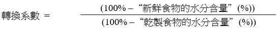 必須注意的是,食物樣本在弄乾或脫水之前和之後的水分含量受多個因素(包括品種、季節、地理位置、加工要求等)影響而有差異。因此,直接化驗食物樣本在加工之前和之後的水分含量,可較準確估計轉換系數。如使用公認數據,業界應確保數據來源準確和可靠。鄰近地區食物成分資料庫的實例載於《食物攙雜(金屬雜質含量)規例》指引的附件II。 部分乾製食用真菌的轉換系數示例如下: